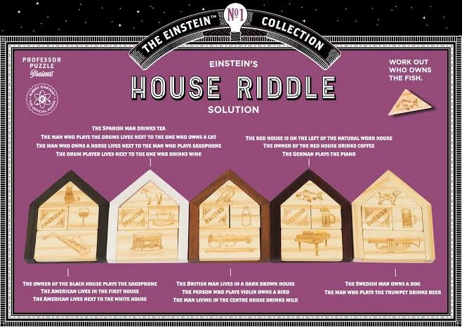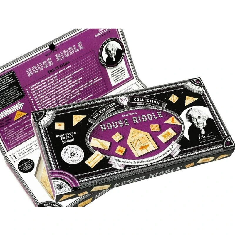 It’s a fun but challenging test of deductive reasoning. Use the 15 clues to arrange the pieces of the wooden houses so you can work out who owns the fish